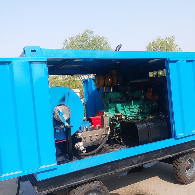 工作原理:疏通机使用柴油机驱动高压泵产生高压水射流,通过高压软管将疏通喷嘴连结到高压泵上,然后将喷嘴直接放在管道中需要疏通。高压泵工作时,使用喷嘴的后部。喷射的高压水产生的反作用力将喷嘴迅速向前促进,并使用喷嘴前后的喷嘴产生的高压水射流。喷嘴以迅速清洁管道。当软管卷收器将喷嘴向后拉时,高压河水将从管束中洗出的排泄物从管中清除。