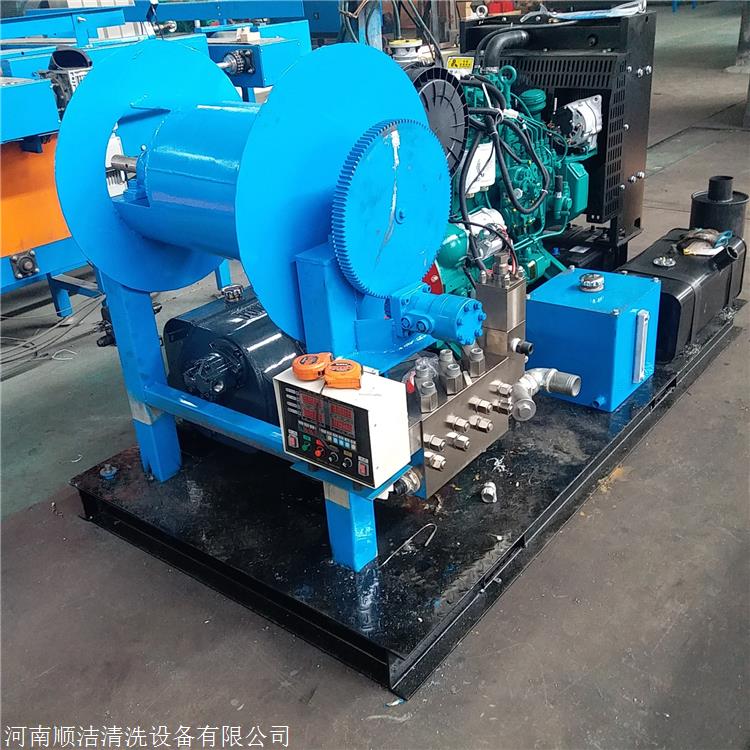 工作原理:曲轴带动连杆促进柱塞促进往复运动。高压水射流是通过关闭进口阀和出口阀而产生的。高压水射流通过高压软管被输送到疏通喷嘴,从而使来自喷嘴后孔的高压水射流冲击。在管壁上产生反作用力,使喷嘴驱动高压管道迅速向前疏通,并使用喷嘴前后喷嘴孔产生的高压水迅速清洗管道。当卷管器将喷嘴向后拉时,高压河水将洗净的污垢从管束中抽出,从而达到疏通管道的目的。