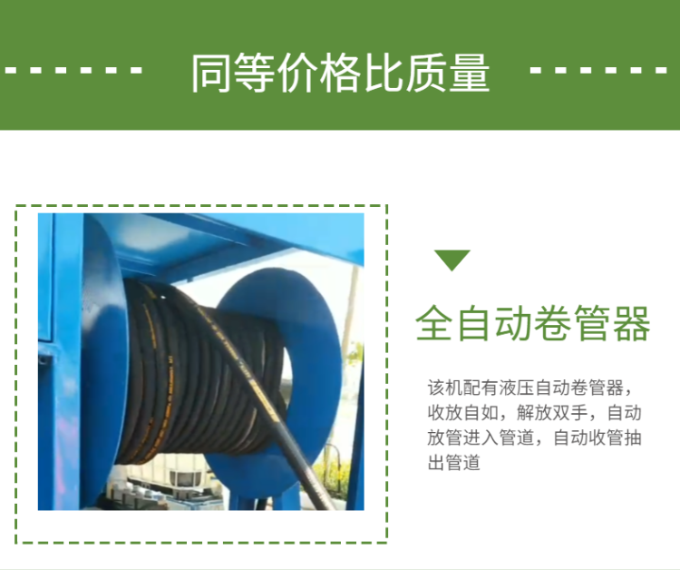 产品详情:产品特色:高压泵使用德国WOMA先进技术,立式不锈钢泵头,不锈钢镀镍合金柱塞,强制水冷。高压泵箱材质球墨铸铁,散热性好,质地坚硬,不易变形;纯高压清洁水,市政排污管道清洗机无需添加任何化学药物,绿色环保,无污染,工友无需下井,施工更安全,是管道疏通高科技设备在业界获得了普遍的推广。