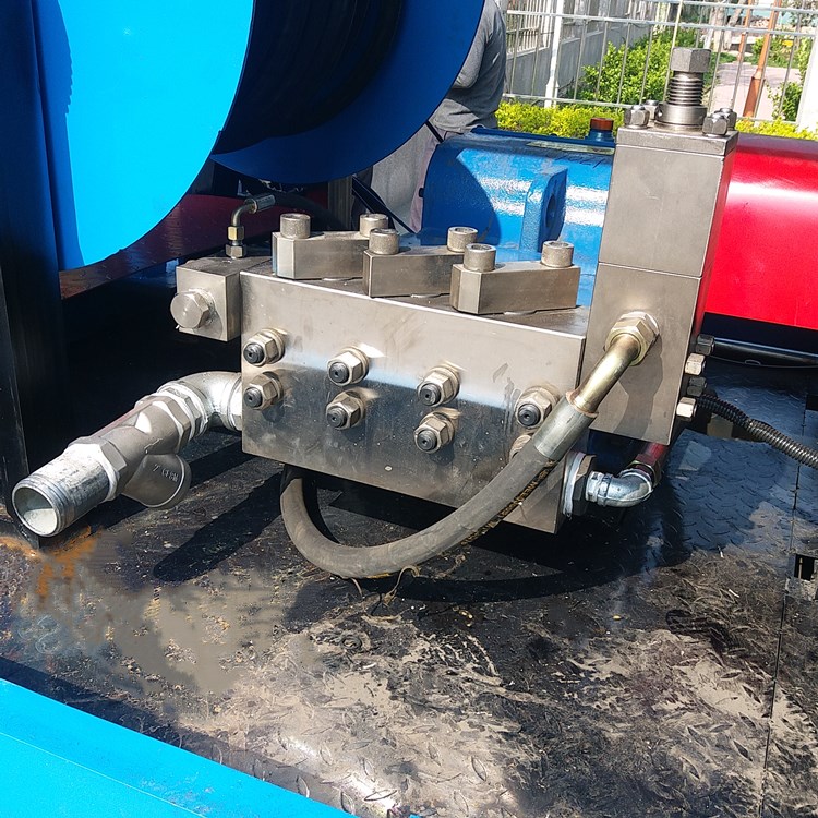 工作原理:曲轴带动连杆促进柱塞促进往复运动。高压水射流是通过关闭进口阀和出口阀而产生的。高压水射流通过高压软管被输送到疏通喷嘴,从而使来自喷嘴后孔的高压水射流冲击。在管壁上产生反作用力,使喷嘴驱动高压管道迅速向前疏通,并使用喷嘴前后喷嘴孔产生的高压水迅速清洗管道。当卷管器将喷嘴向后拉时,高压河水将洗净的污垢从管束中抽出,从而达到疏通管道的目的。