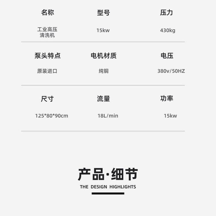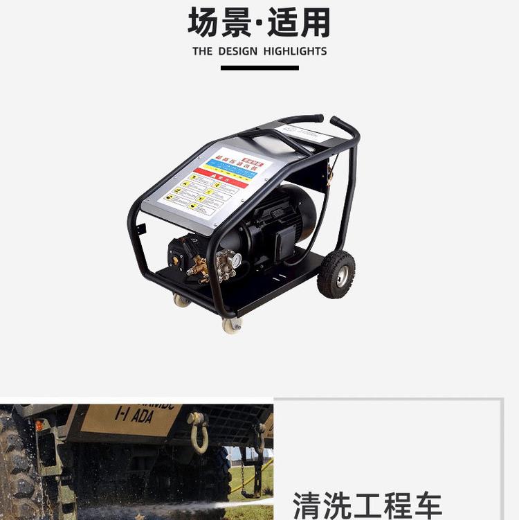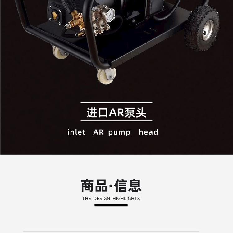 产品详情:产品特征:高压清洗机的高压泵为意大利COMET原装进口泵,铜泵头,陶瓷柱塞;调压阀为不锈钢阀体,合金阀芯阀座。耐高温,耐高压,耐腐蚀兼具体积小,重量轻,操作和移动简便的特征;纯高压水清洗,不必添加任何化学药物,无粉尘,无污染,是清洗行业提倡的高科技设备;
